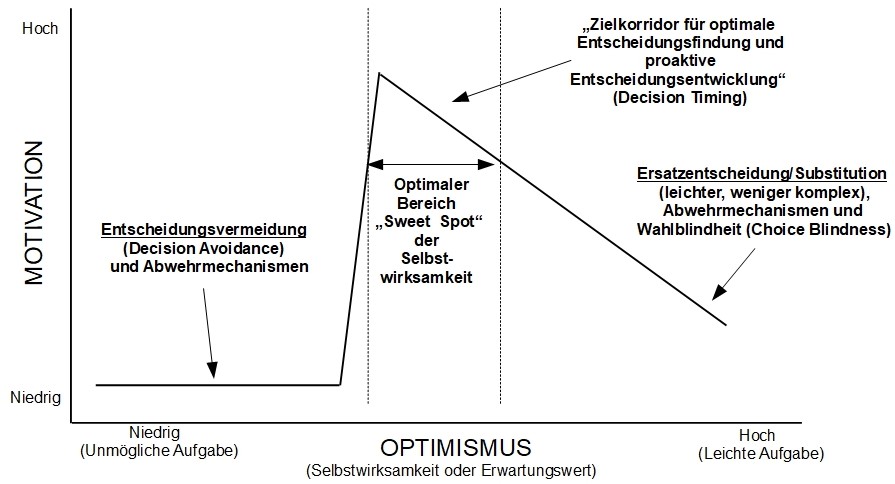 Ziel des Decision Timings – Proaktive Entscheidungsentwicklung ist es, Entscheider in den „Sweet Spot“ oder optimalen Bereich der Selbstwirksamkeit zu führen (siehe Bild 2, oberhalb Mitte), damit für den Entscheidungsprozess ein Höchstmaß an Motivation und realistischer Optimismus zur Verfügung stehen. Mit anderen Worten geht es darum, im Entscheidungsprozess zu erkennen und auszuloten, welche Entscheidung nicht zu schwer und auch nicht zu leicht ist. Wie so oft im Leben, liegt auch hier das Optimum, meistens in der Mitte.