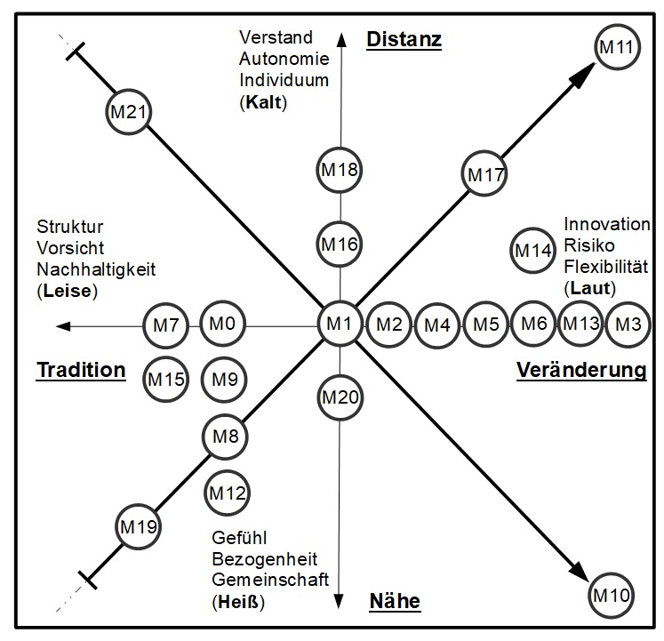 Jede der hier definierten 21 Methoden (siehe Decision Timing Buch für Details), hat eine eigene Position und Perspektive im Bezug auf die Dimensionen von Distanz & Nähe, sowie Tradition & Veränderung. Als direkt, körperliche Erfahrung, kann dies auch in den Dimensionen von Temperatur und Schallintensität, individuell verortet, geprüft und bewertet werden.